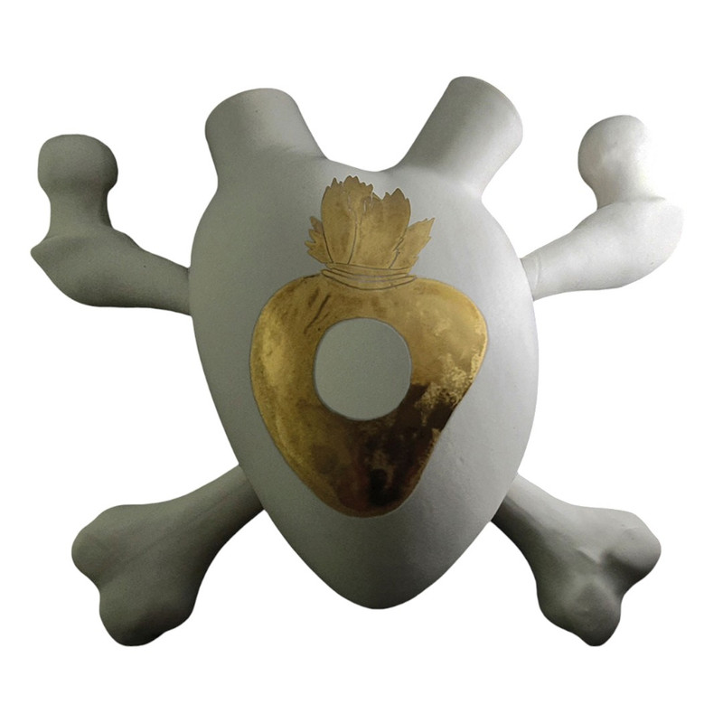 A heart-shaped porcelain ex-voto that is also a container: for flowers, ideas, messages, decorated with graphic and plastic motifs: letters, numbers and figures painted with a brush; small handmade sculptures for contemporary messages written in a universal language. Each heart has its own rhythm, its own beat, its own meaning, between irony and divertissement.