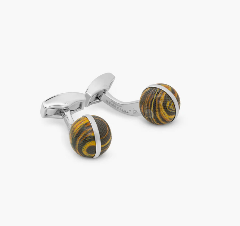 Our iconic Guilloche pattern is intricately carved on tiger eye spheres, replicating the finishes of sophisticated watch dials. An intricate and complex process which requires incredible attention to detail and an engineering feat for laser engraving. Set on a rhodium plated base metal case.