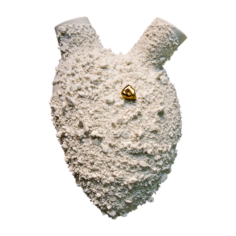 A heart-shaped porcelain ex-voto that is also a container: for flowers, ideas, messages, decorated with graphic and plastic motifs: letters, numbers and figures painted with a brush; small handmade sculptures for contemporary messages written in a universal language. Each heart has its own rhythm, its own beat, its own meaning, between irony and divertissement.