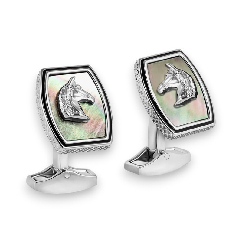These equestrian-inspired cufflinks are a poignant addition for the upcoming Lunar Year of the Horse, featuring a 3D Ascot-inspired horse design set against either black mother of pearl. Each cufflink boasts a vertical tonneau shape crafted from polished palladium-plated base metal. A hand-painted enamel border in black enhances the design. These cufflinks blend traditional motifs with a touch of modern elegance.