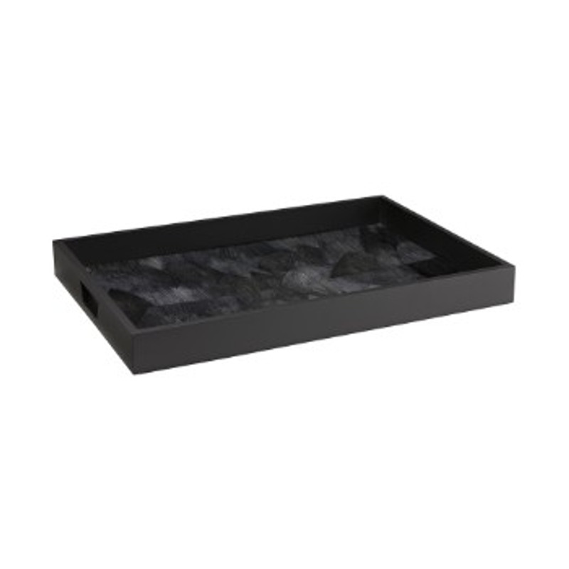 A unique balance between natural characteristics and modern aspects, our Trevino Tray serves up some serious style. Corn husk pieces are finished in a black stain and fashioned in a mirrored pattern before being sealed to create this distinctive piece. The sleek black wood frame lends a polished touch to the natural textures. Great for resting cocktails or displaying curios.