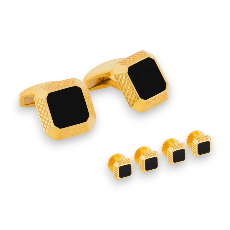 Our state-of-the-art signature cufflinks and studs set featuring an octagonal case with bevelled edges engraved with our classic diamond pattern. This style has been set with onyx in a 1-micron yellow gold-plated sterling silver case.